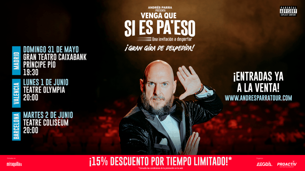 El reconocido actor colombiano Andrés Parra volverá a España en 2026 para despedirse del público con su exitoso espectáculo “Venga que si es pa’ eso”, una propuesta con la que ha girado internacionalmente y que podrá verse por última vez en el país en una serie limitada de funciones.